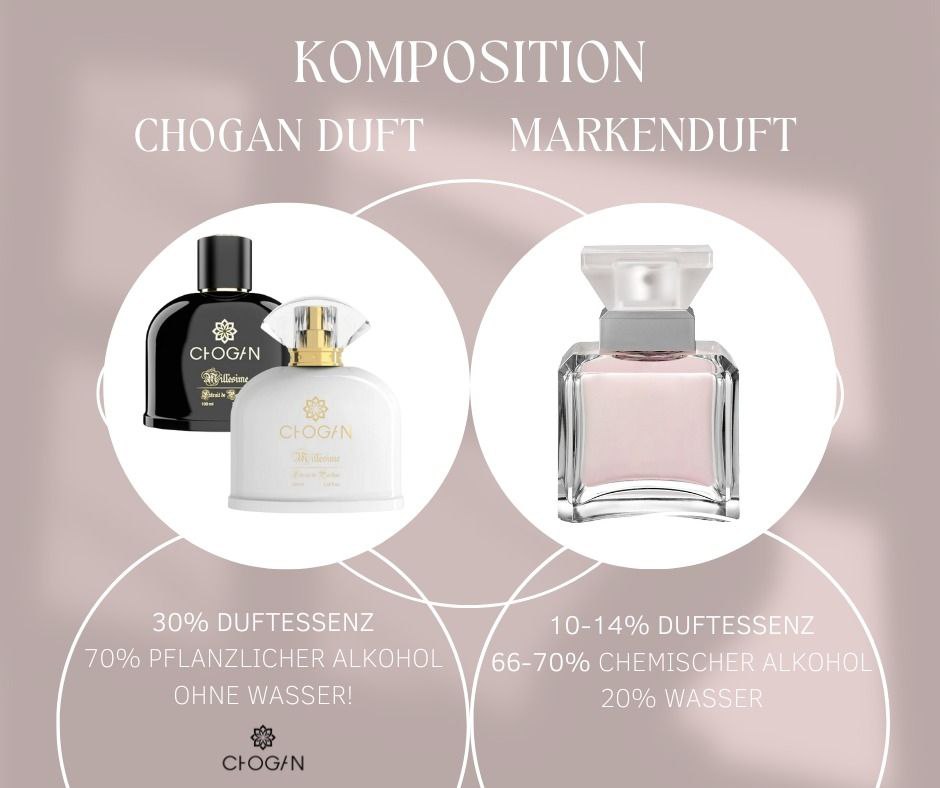 "Die Parfums von Chogan sind mehr als nur ein Duft. Mit 30% Parfumessenz-Extrakt bieten sie die höchste Intensität und eine beeindruckende Haltbarkeit. Als 'Extrait de Parfum' sind sie ein Ausdruck von Qualität und Luxus. Mit dem Einsatz von 'Buongusto'-Alkohol, gewonnen aus Getreide, setzt Chogan auf Natürlichkeit und verzichtet auf Wasser und chemische Fixiermittel."